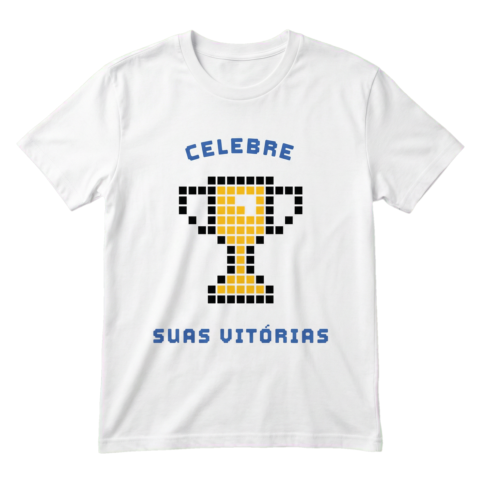 Camiseta com design pixel art em tons dourados e azuis com a mensagem positiva ‘CELEBRE SUAS VITÓRIAS’. Ideal para celebrar cada conquista. Disponível em 9 cores diferentes e 6 tamanhos.